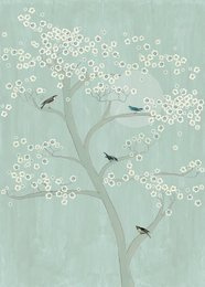 Mural na flizelinie 542141 drzewo wiśni z ptakami na błękitnym tle