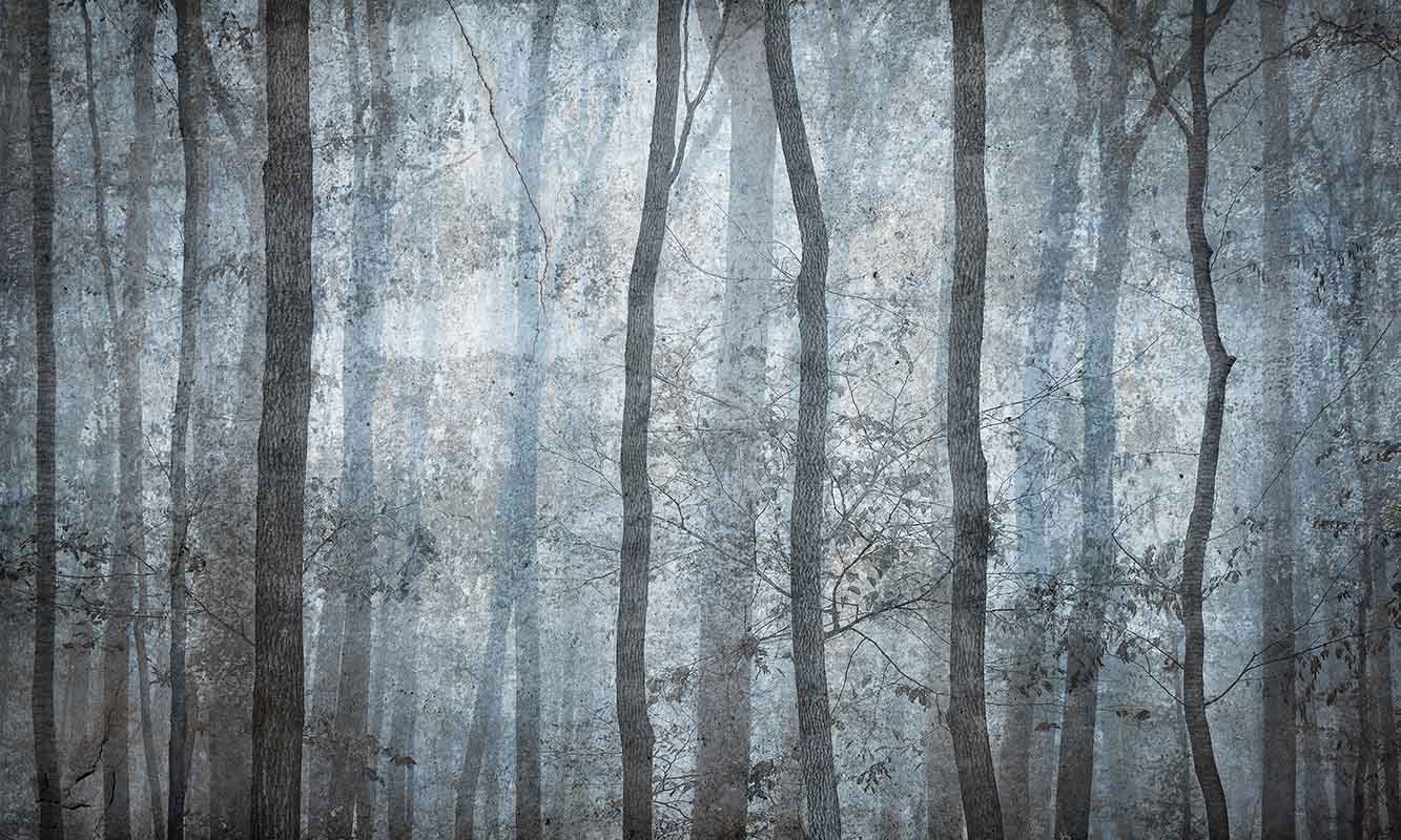 Modna tapeta z drzewami w tajemniczym lesie we mgle, w odcieniach szarości.