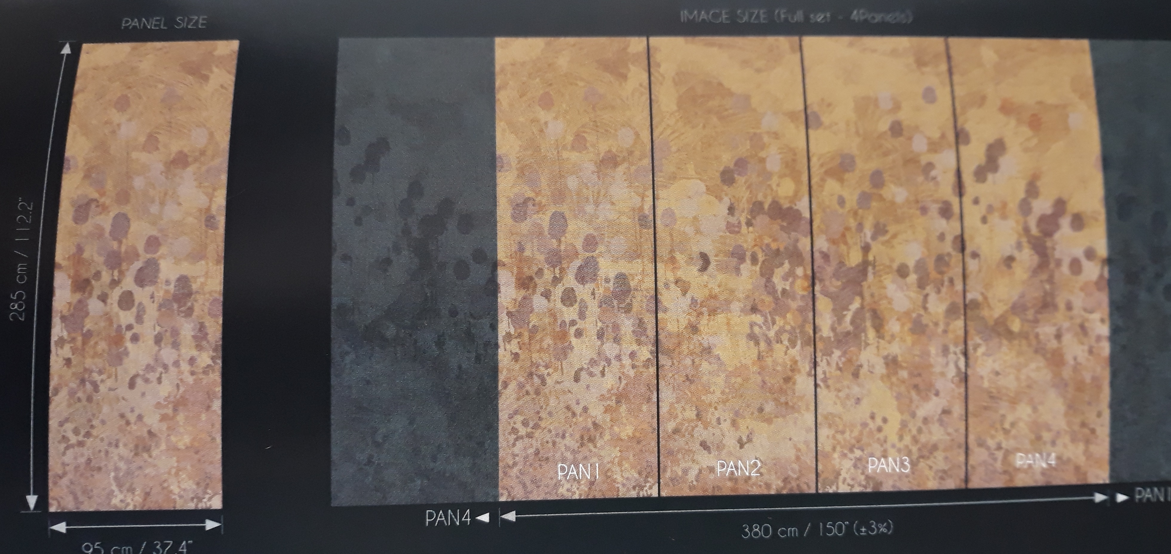 Aranżacja w rozmiarze :szerokość 380cm x wysokość 285cm, przedstawia zestaw 4 paneli .