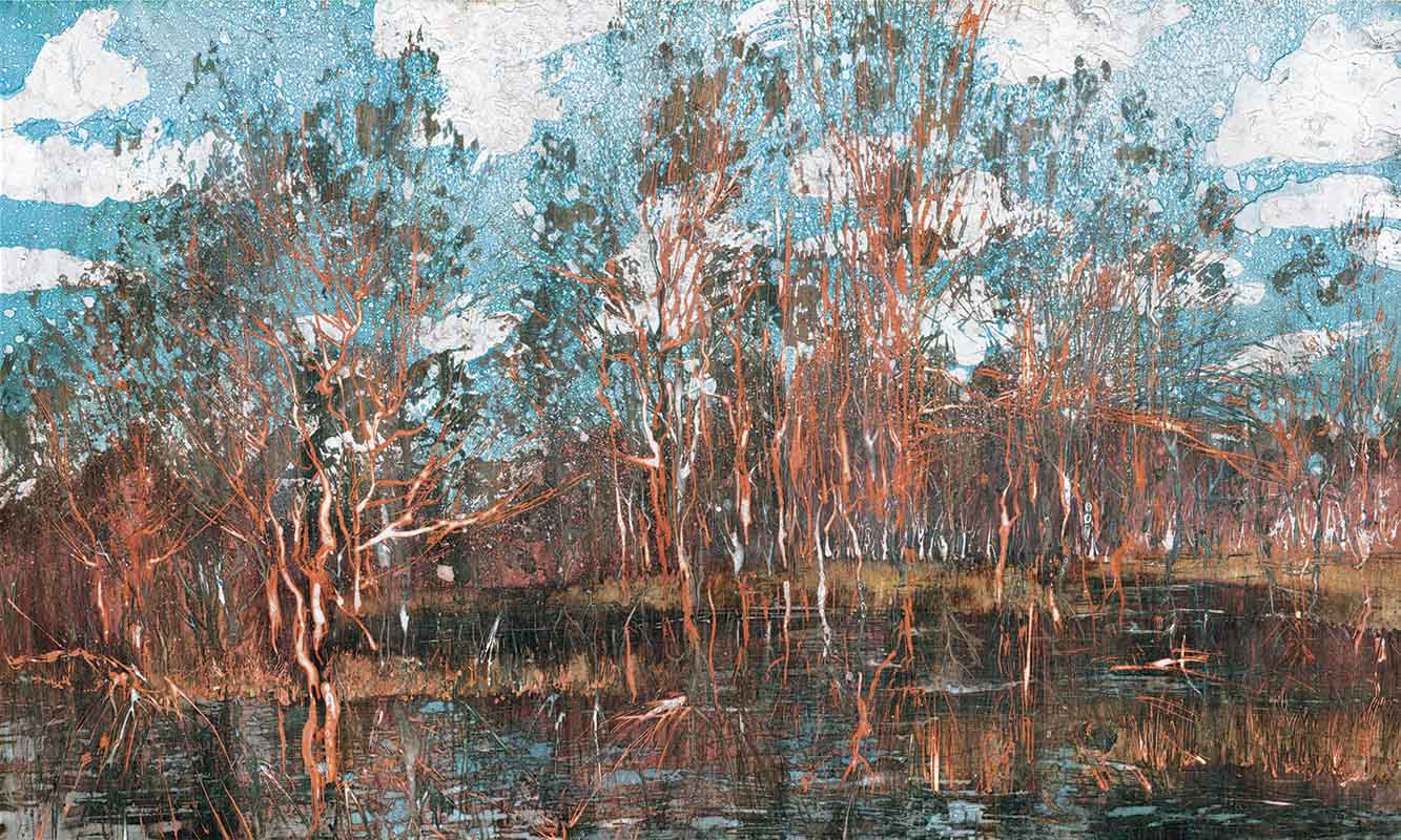 Fototapeta z pięknym malowniczym lasem nad rozlewiskiem w odcieniach koloru błękitnego, brązowego, rudego, sprawia wrażenie głębi i przestrzeni tworząc efekt 3D.