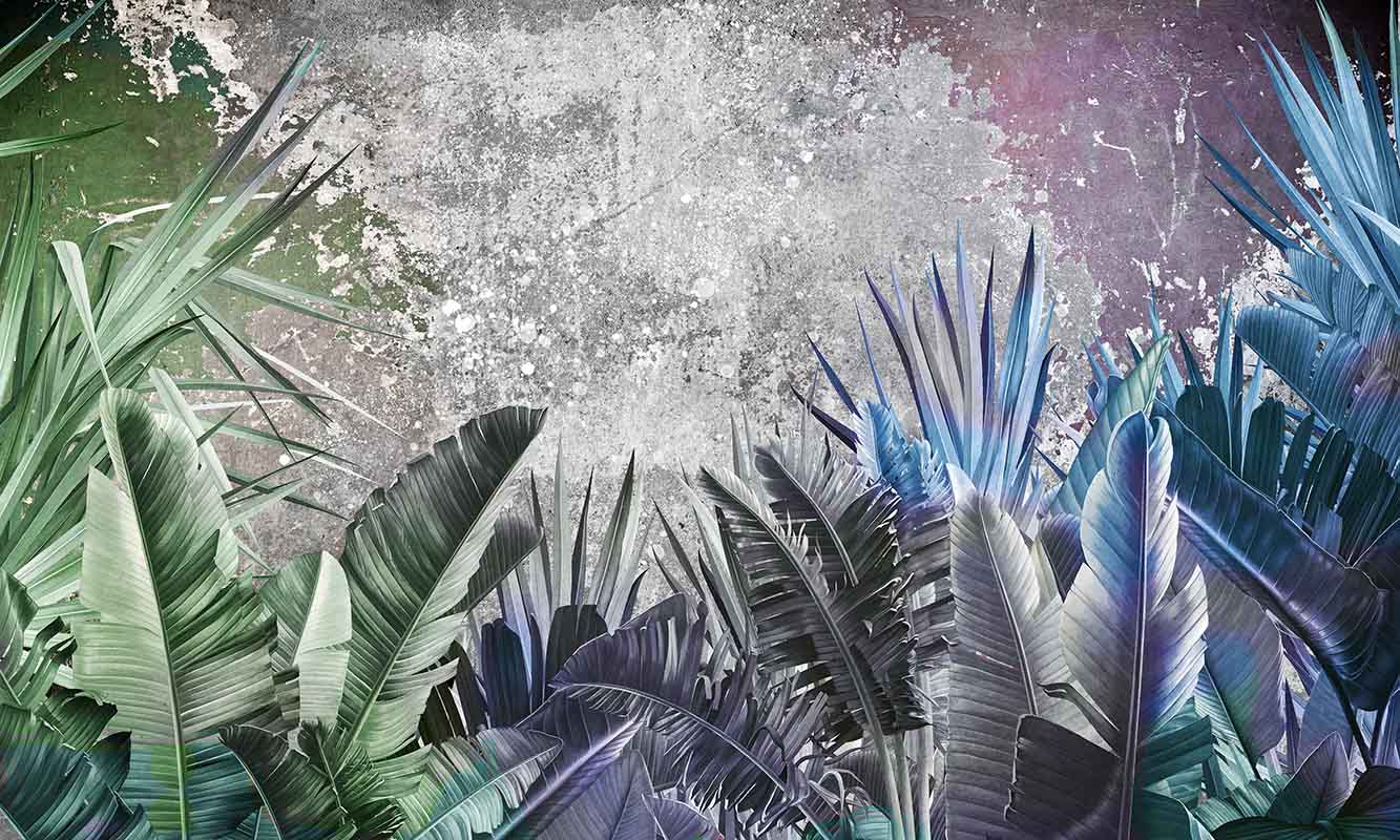 Imponujące duże liście tropikalnych roślin, kwitnących kwiatów w odcieniach zieleni, szarości, fioletu, niebieskiego, na tle tynkowanej betonowej ściany w szarościach, fioletach, zieleni, wyczarują na Twojej ścianie, przyjemny pełen relaksu klimat.