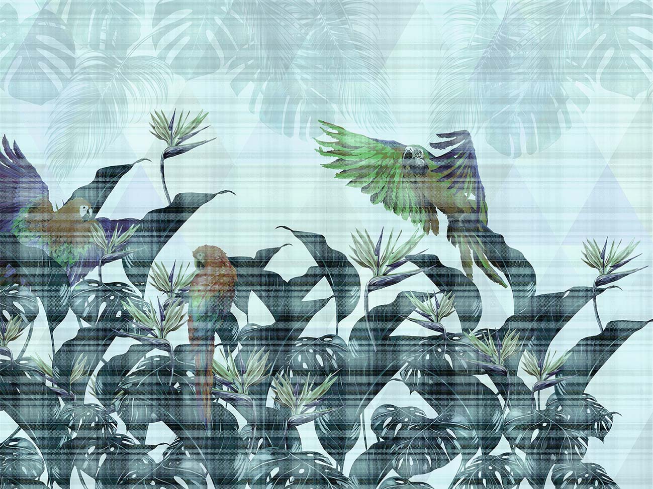 Zachwycająca fototapeta z dużymi liśćmi, kwiatami tropikalnych roślin i pięknymi papugami w przyjemnych, harmonijnych odcieniach niebiesko zielonego koloru, spokojnego turkusu, szmaragdu, wyczarują na Twojej ścianie, pełen relaksu klimat. Fototapeta z nowoczesną grafiką, z wyczuwalną w dotyku strukturą , modnym efektem 3D, doskonale wpisuje się w aktualne i modne trendy w aranżacji wnętrz. Doskonale sprawdzi się w salonach, sypialniach, gabinetach, tworząc w nich niezwykłą, zapadającą w pamięć magiczną atmosferę.