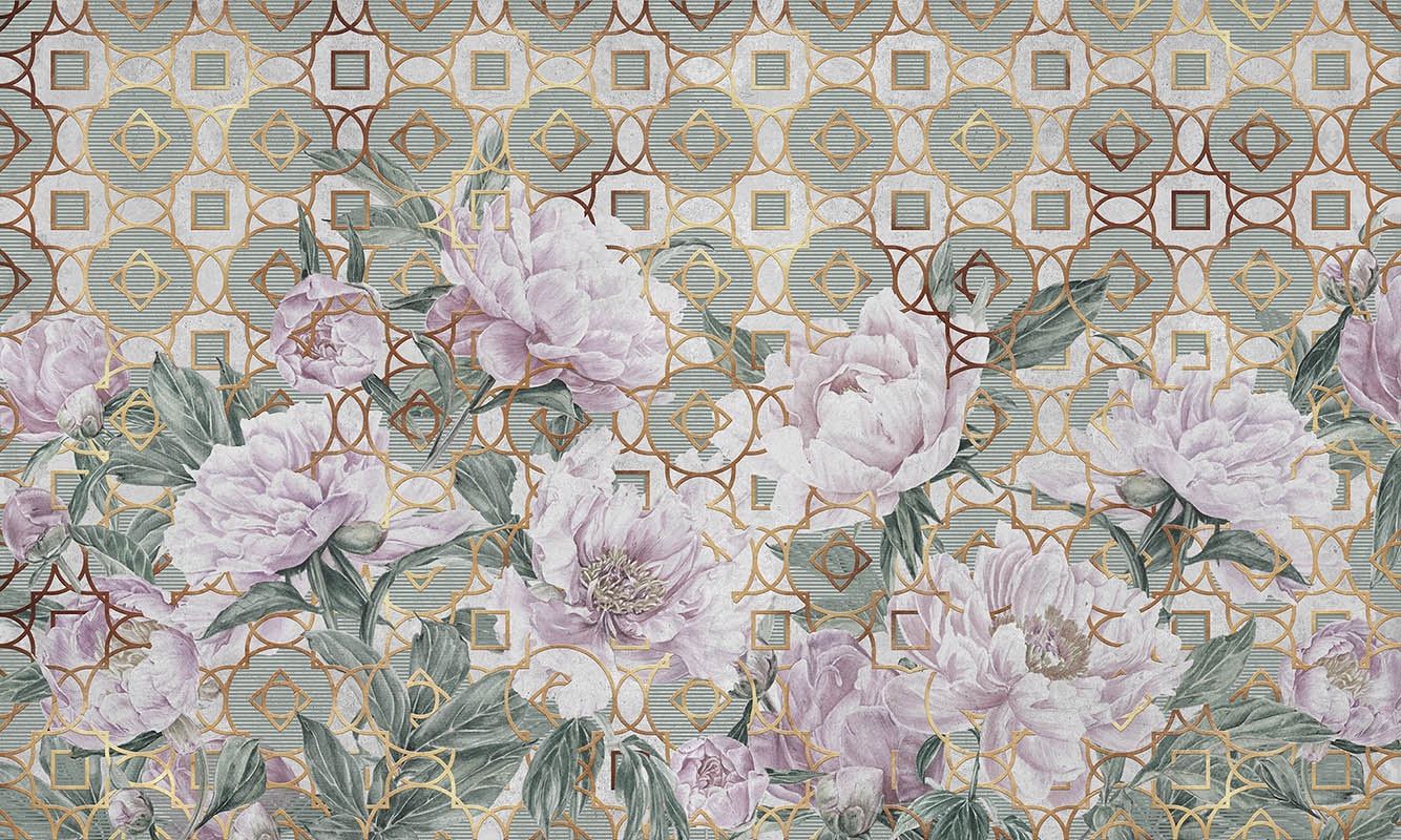 Malownicze kwiaty piwonii oraz geometrycznym, ornamentowym wzorem przypominającym kratownicę, ogrodowy trejaż. Całość utrzymana w spokojnych, pastelowych kolorach: rozbielonych beżach z przenikającymi się kolorami odcieni niebieskiego, kremowego, delikatnego różowego tworzą magiczny klimat. Fototapeta z nowoczesną grafiką, z wyczuwalną w dotyku strukturą, lekkim satynowym blaskiem, doskonale wpisuje się w modne trendy w aranżacji wnętrz, tworząc w nim niezwykłą atmosferę.