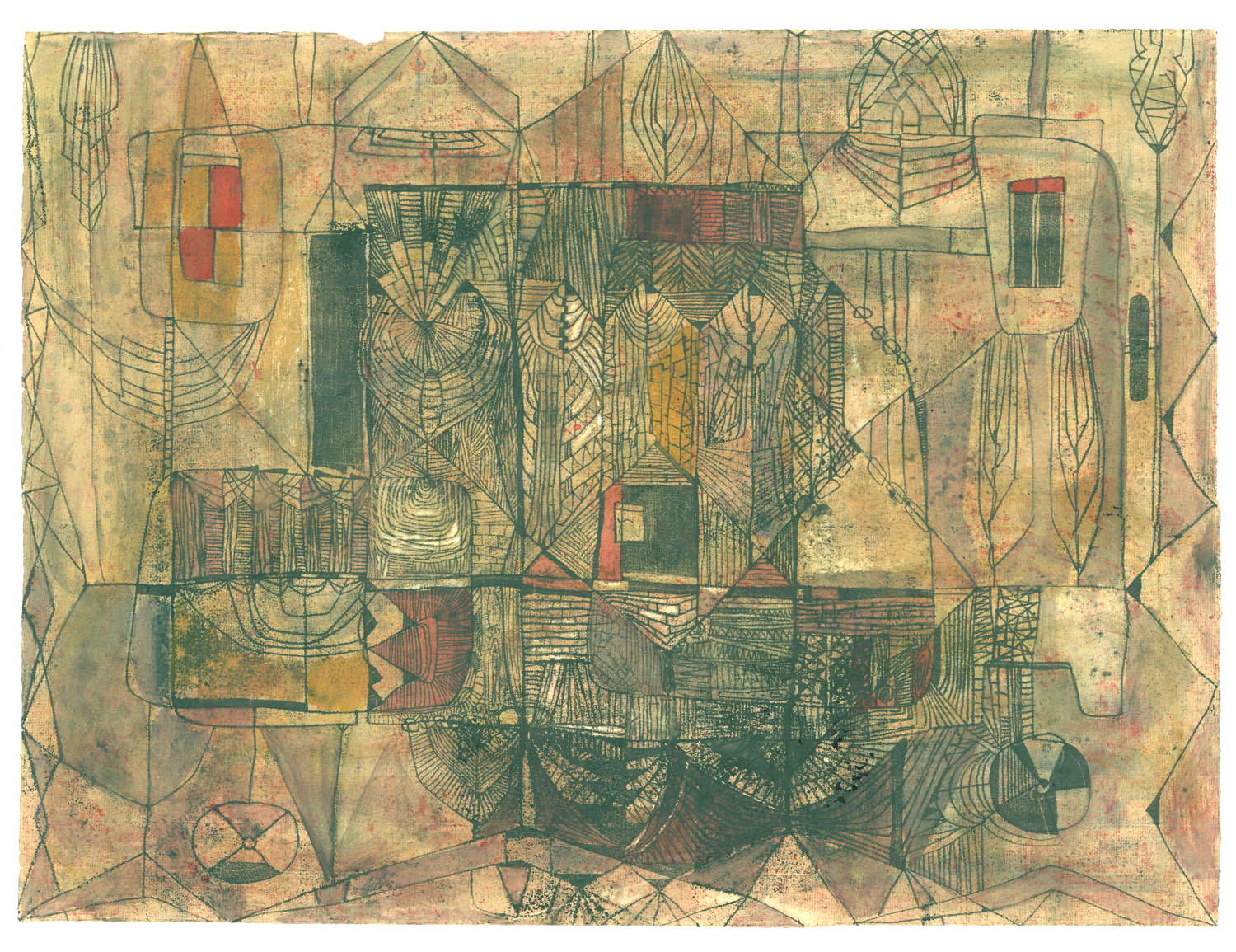 Praca Franciszka Michałka z lat 60. , która zainspirowała jego syna do stworzenia w 2017 roku wielkoformatowej kompozycji „Nad Sepikiem”.