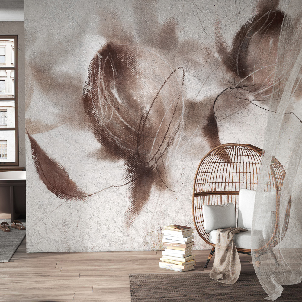 Fototapeta z nowoczesną grafiką, z wyczuwalną strukturą, w dotyku lekko chropowata, sprawiająca wrażenie głębi i przestrzeni. Trzy duże abstrakcyjne kwiaty egzotycznej rośliny, w odcieniach łagodnych beży, brązów umieszczone są na jaśniejszym prostym tle, przypominającym mur, ścianę z widocznymi rysami, pęknięciami, przetarciami. Piękna autorska grafika, wydrukowana na doskonałej jakości materiale, z prostą elegancją ozdobi każde wnętrze.