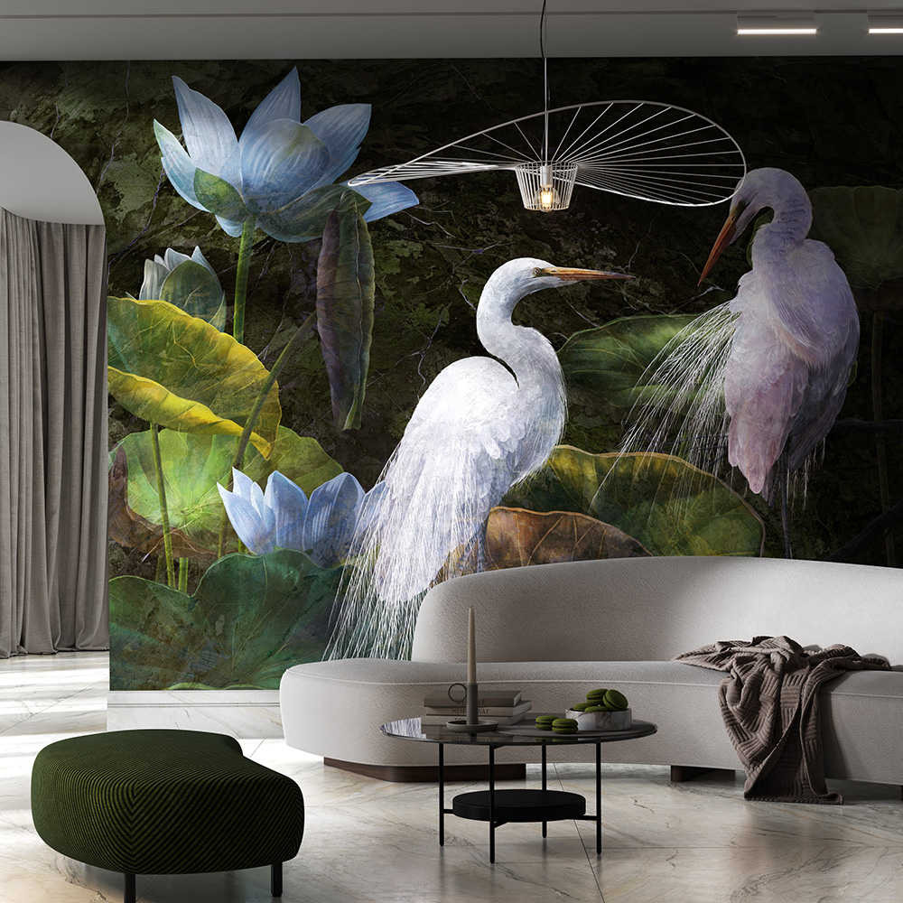 Fototapeta z nowoczesną grafiką, z wyczuwalną fakturą, w dotyku lekko chropowata. Dwa duże białe ptaki spacerujące wśród liści i kwiatów zachwycają swoim wyglądem. Oryginalny autorski projekt, wydrukowany na wysokiej jakości materiałach, będzie wspaniałą ozdobą każdego wnętrza, tworząc w nim niepowtarzalny klimat, nikogo nie pozostawia obojętnym....