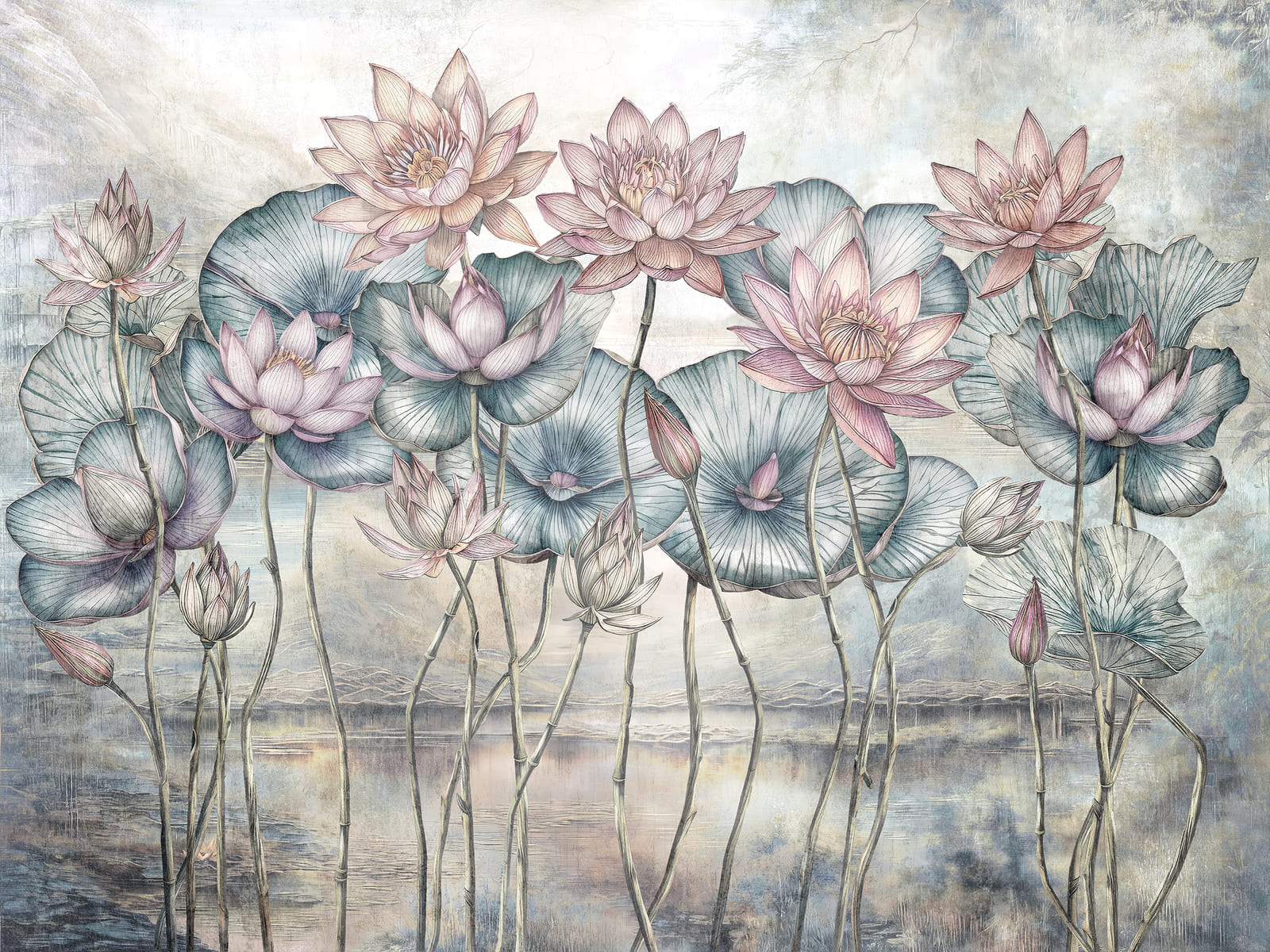 Daj się oczarować romantycznej tapecie Lotos. Jej okazałe kwiaty lotosu unoszące się na tafli jeziora, nadają pomieszczeniom wyrafinowanego charakteru, podkreślając ich estetykę i styl.